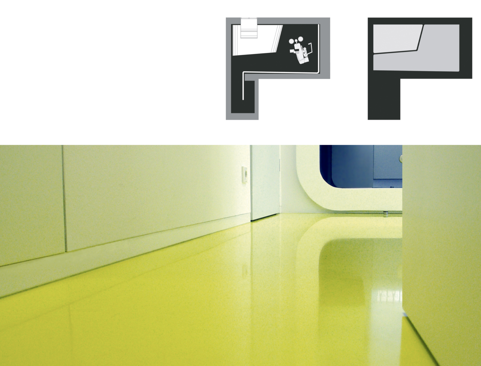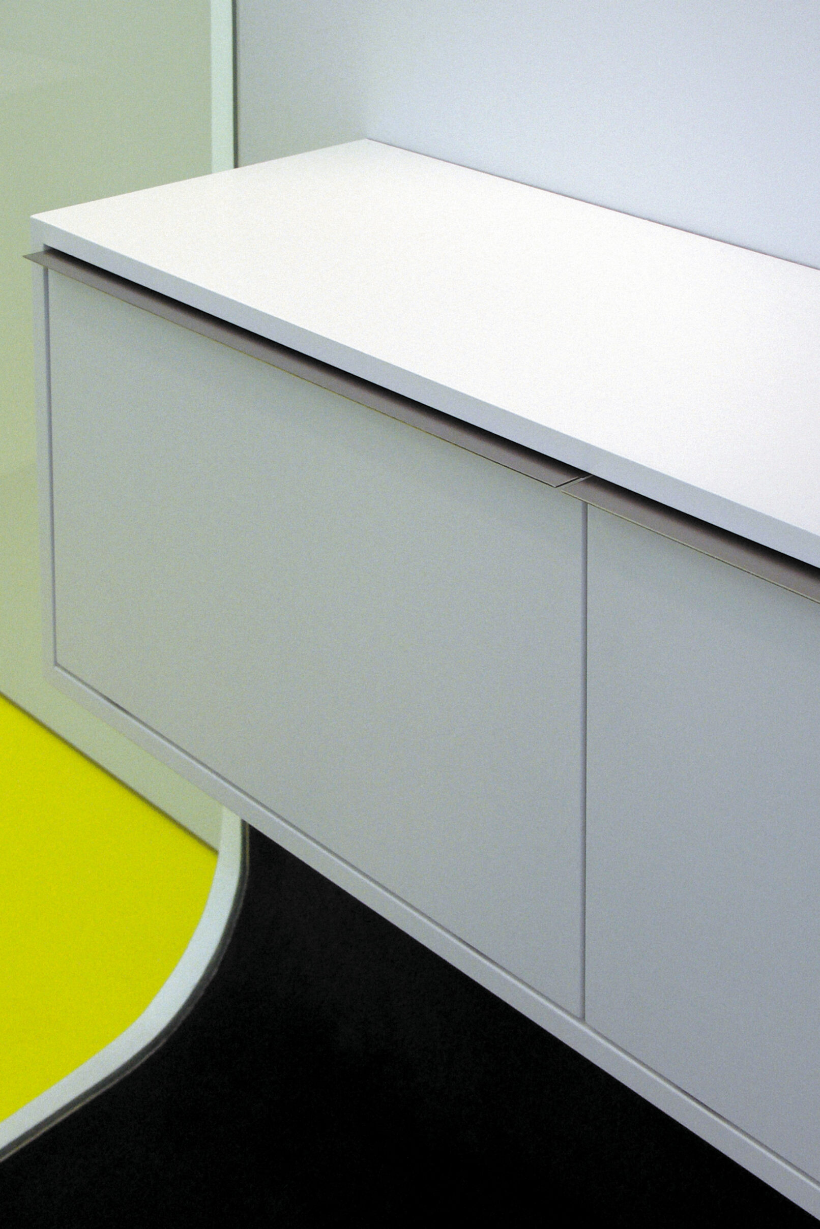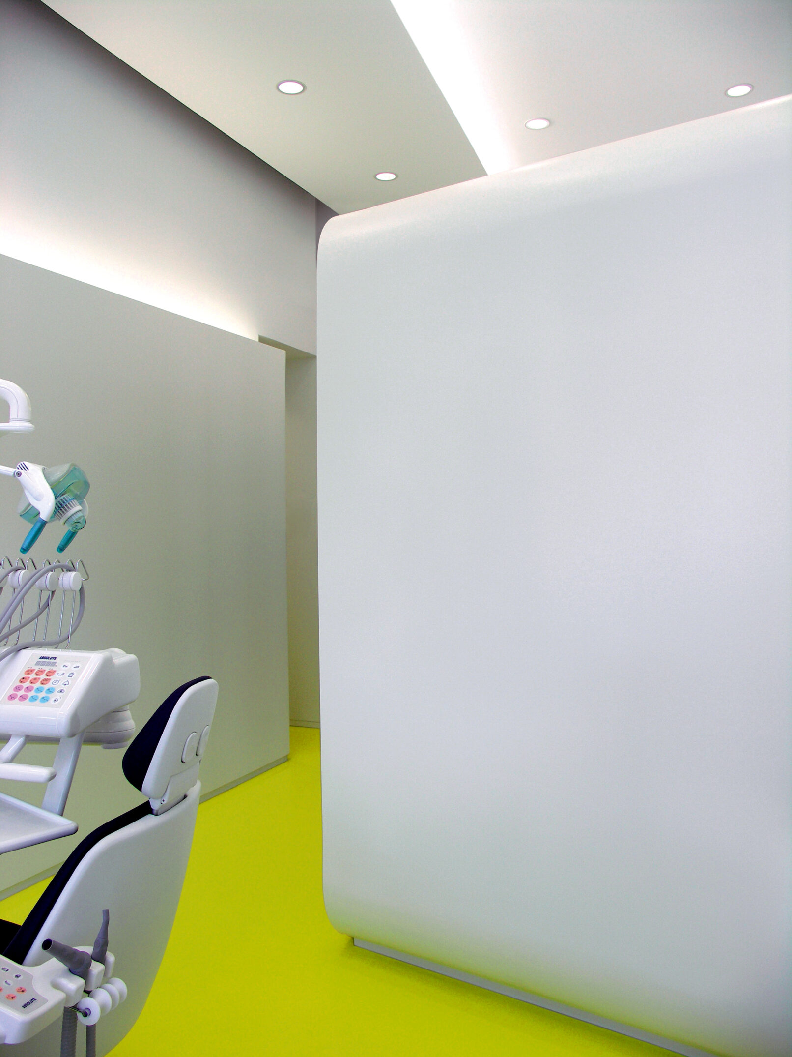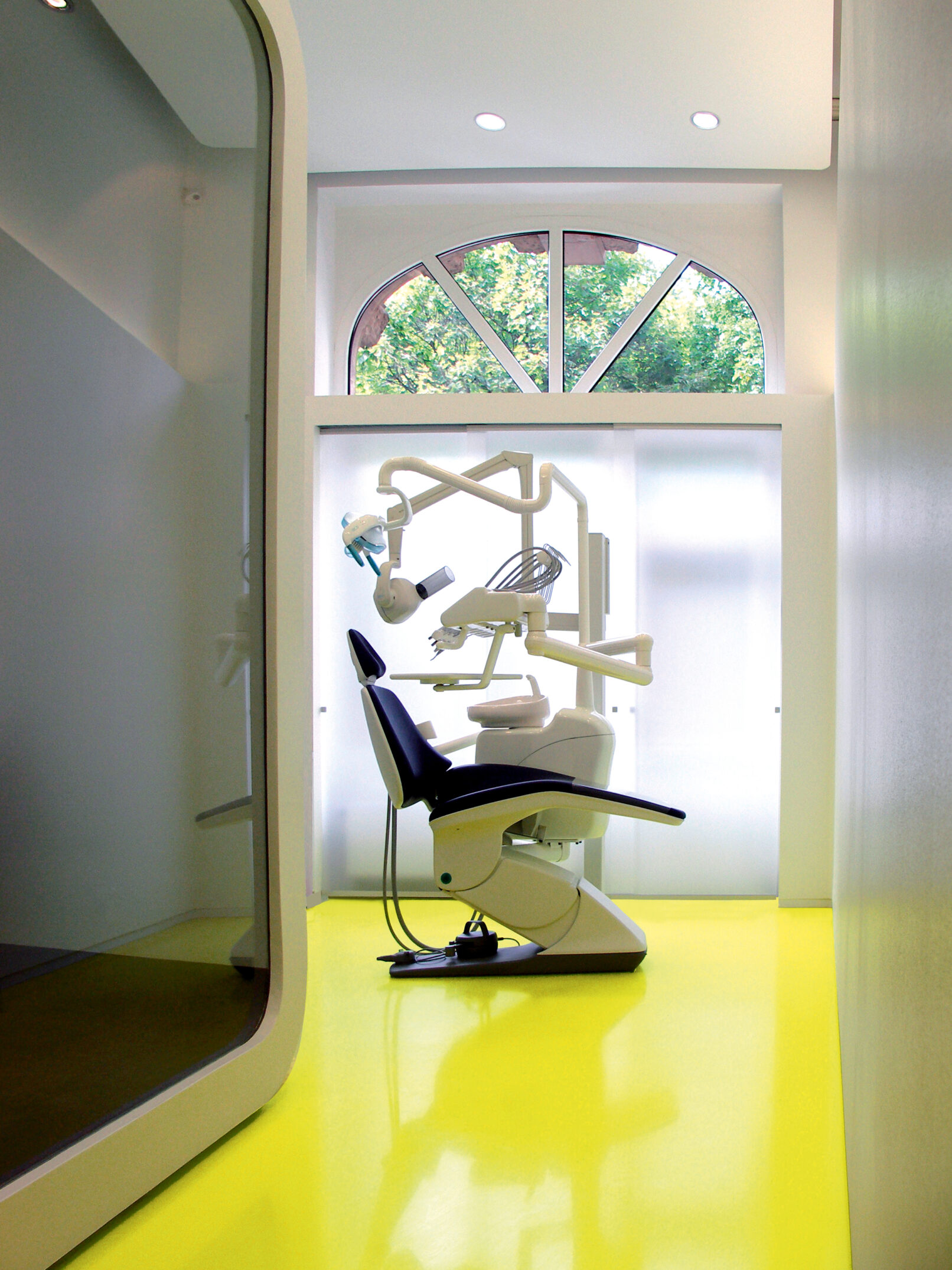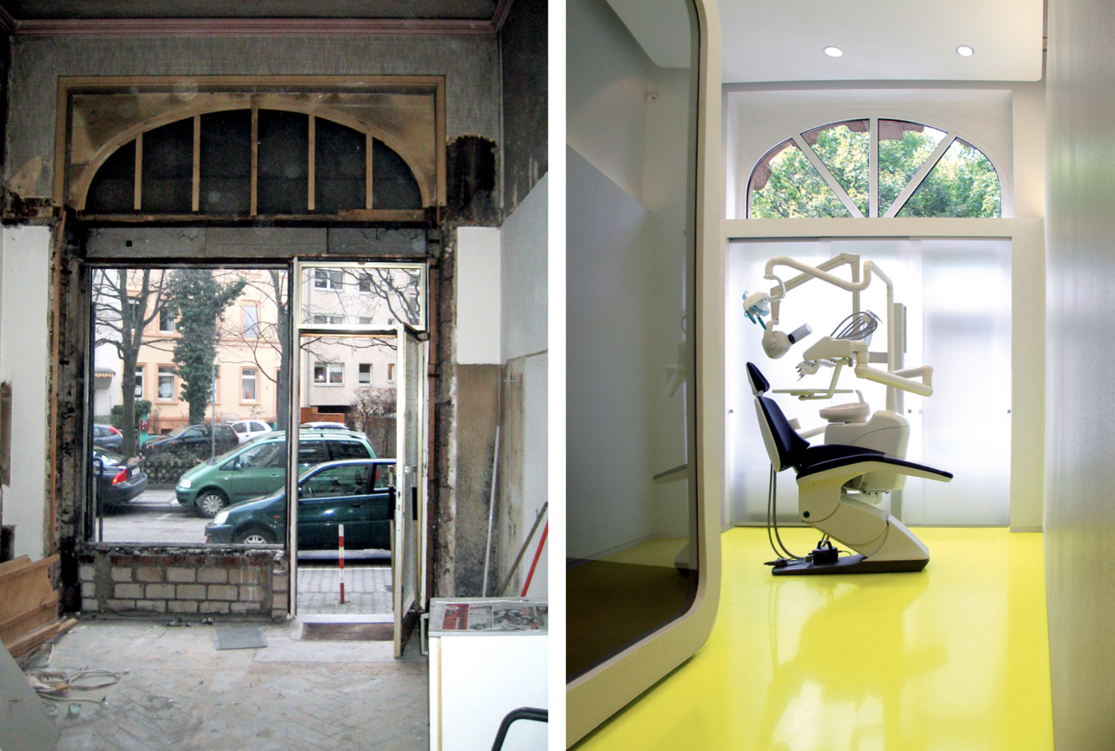 In dem ehemaligen Friseurgeschäft mussten, als Erweiterung der Zahnarztpraxis im ersten Obergeschoss, ein Behandlungsraum, ein Raum für Mitarbeiter sowie Stauraum miteinander in Einklang gebracht werden.