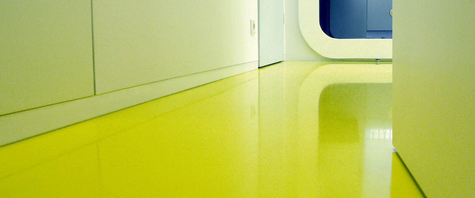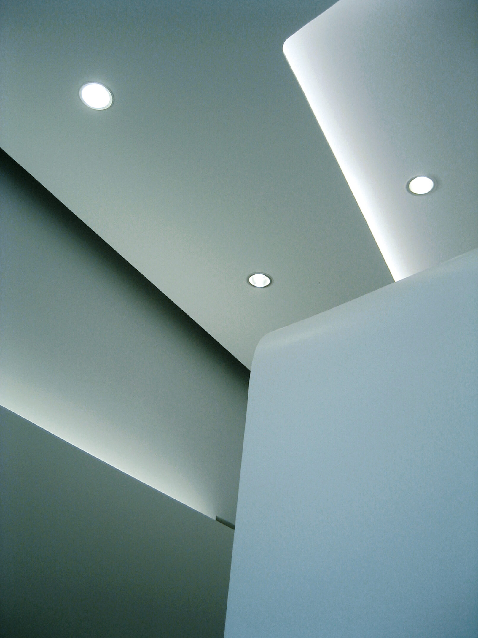 Die fließende, weiche Formensprache und das Licht- und Schattenspiel nehmen dem Raum die karge Strenge, ebenso die akzentuierte Auswahl unterschiedlicher Weißtöne für Wand- und Deckenflächen sowie die prägnante Bodenfarbe.