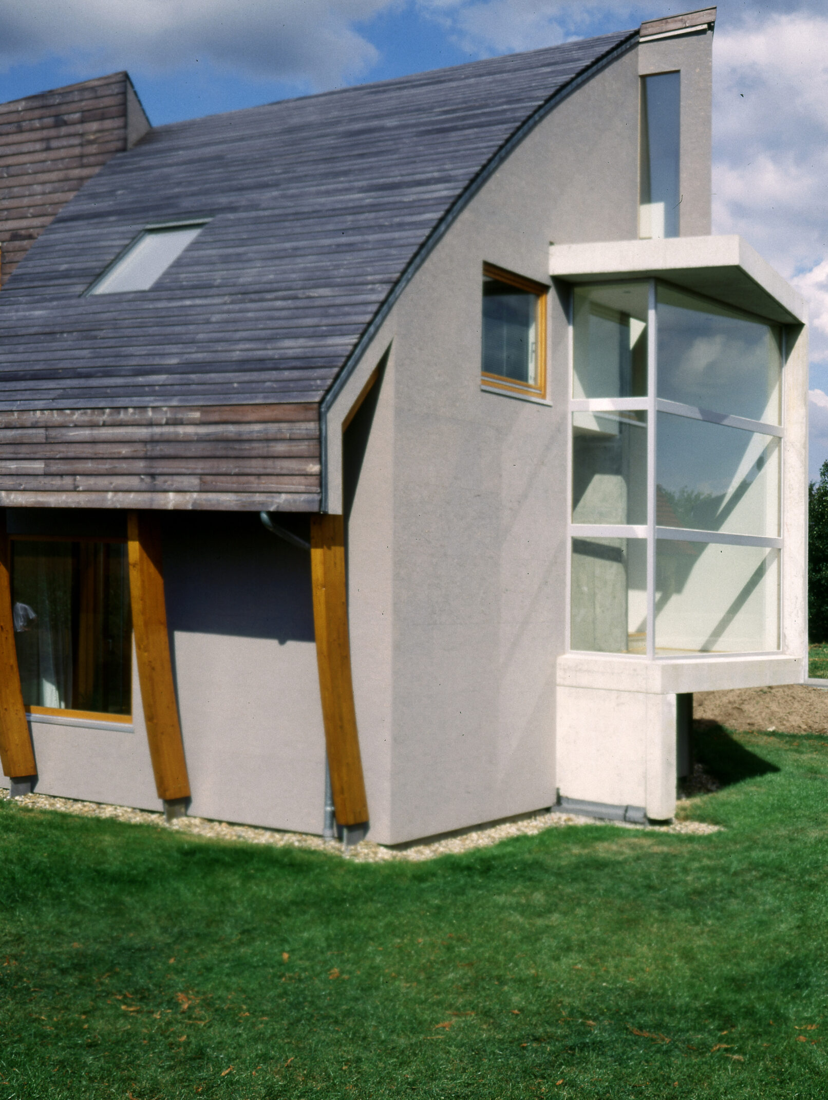 Ein Haus an der Grenze zwischen Dorf und Feldern reagiert auf diese unterschiedlichen Parameter: Zur Gemeinde geschlossen wie eine auf dem Kopf stehende Arche und offen zur Natur.