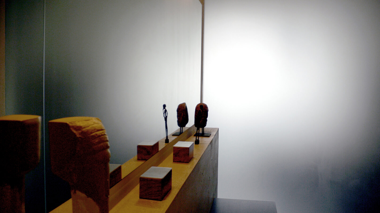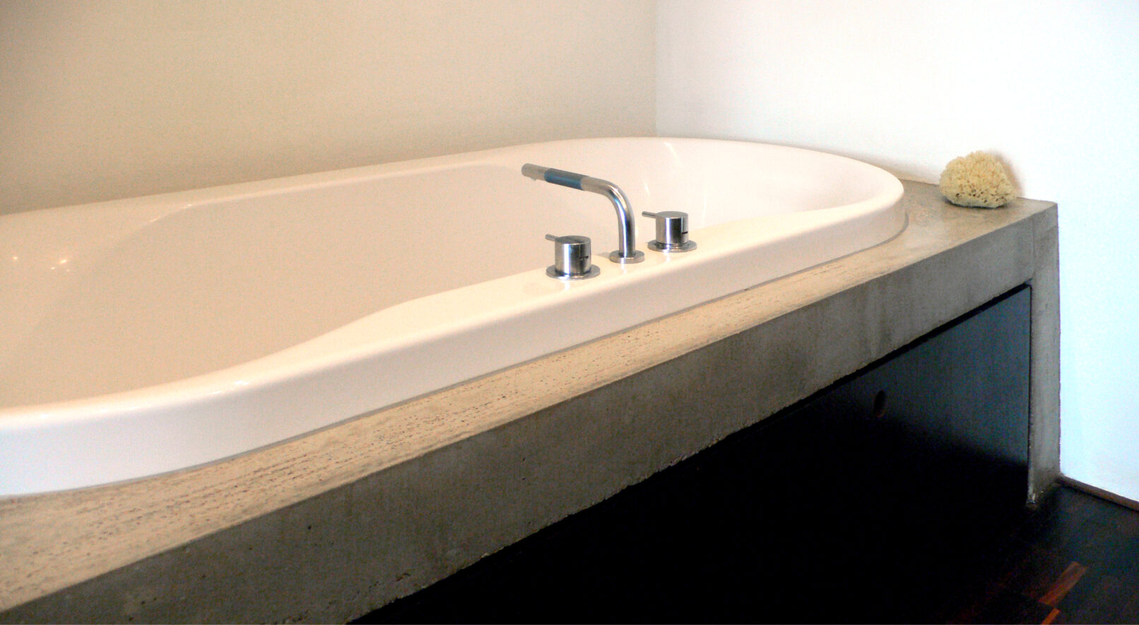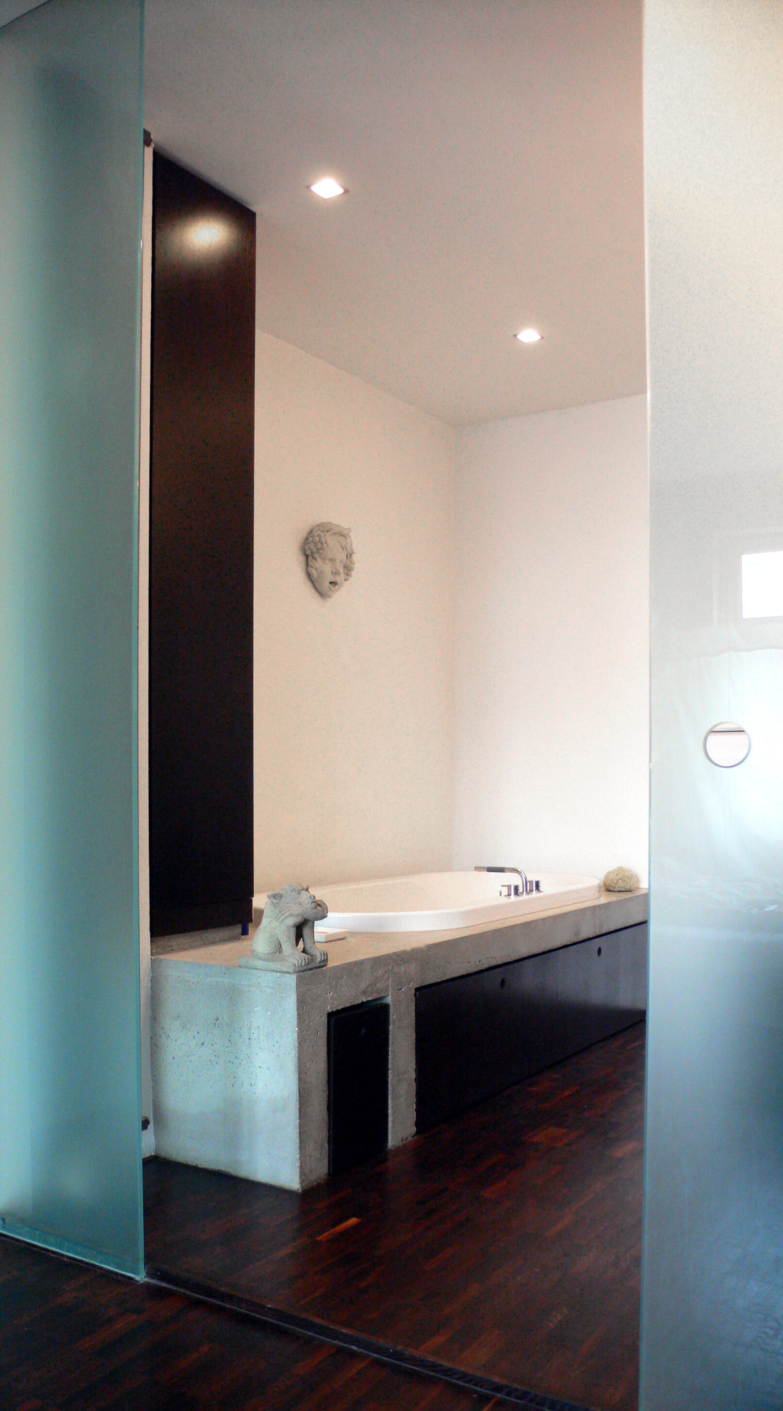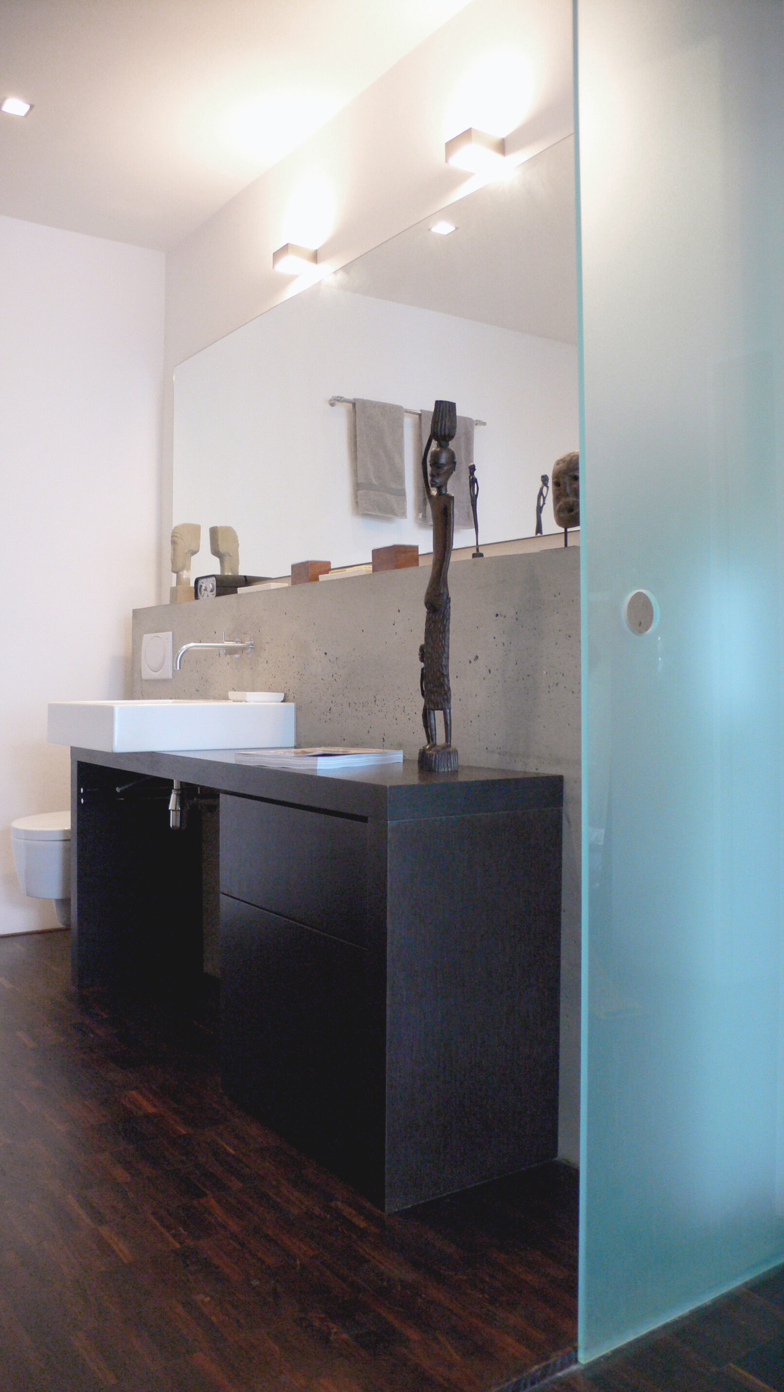 Ein Bad für und mit einem Grafik-Designer, komponiert wie ein 2-dimensionales Bild. Mit Beton, Holz, Keramik und Licht.