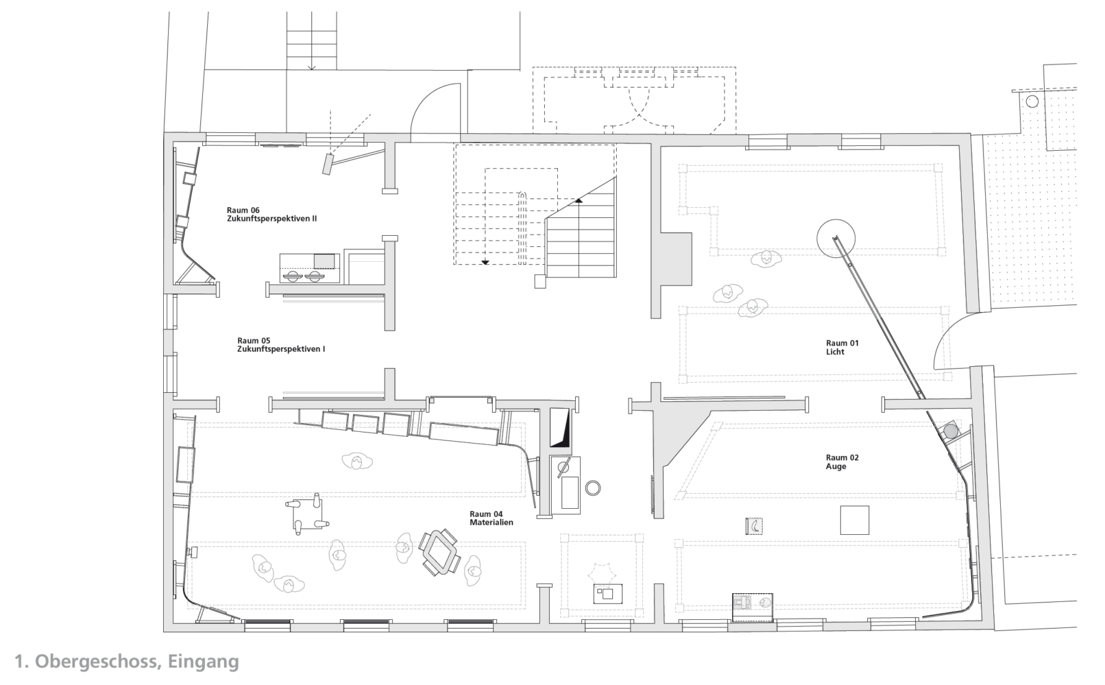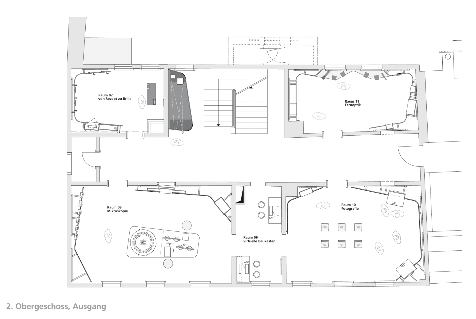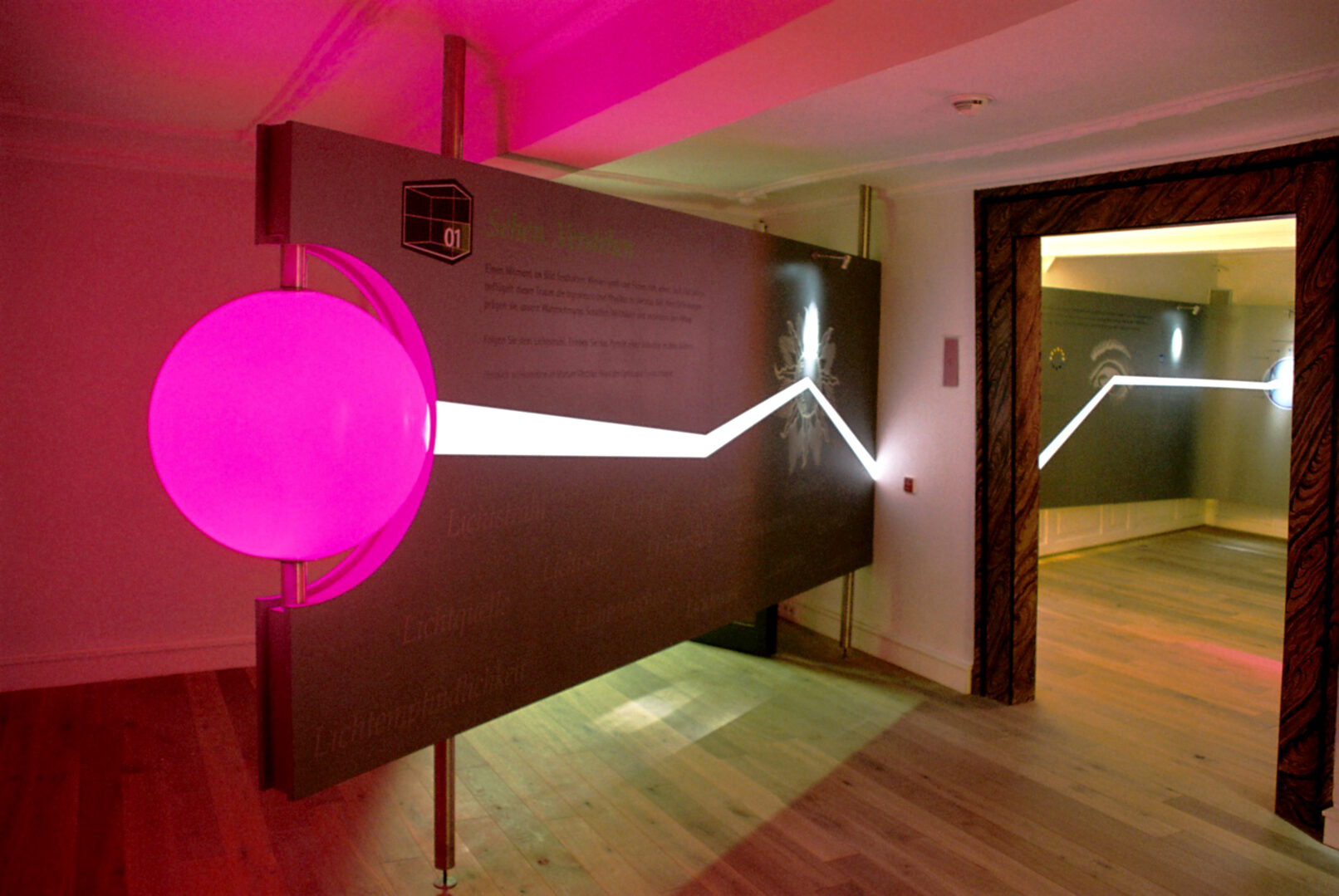 Das allen beteiligten Firmen gemeinsame Element „Licht“ wird als Klammer des gemeinsamen Auftritts inszeniert. Der gebaute Lichtstrahl führt als Leitmotiv durch die gesamte Ausstellung.